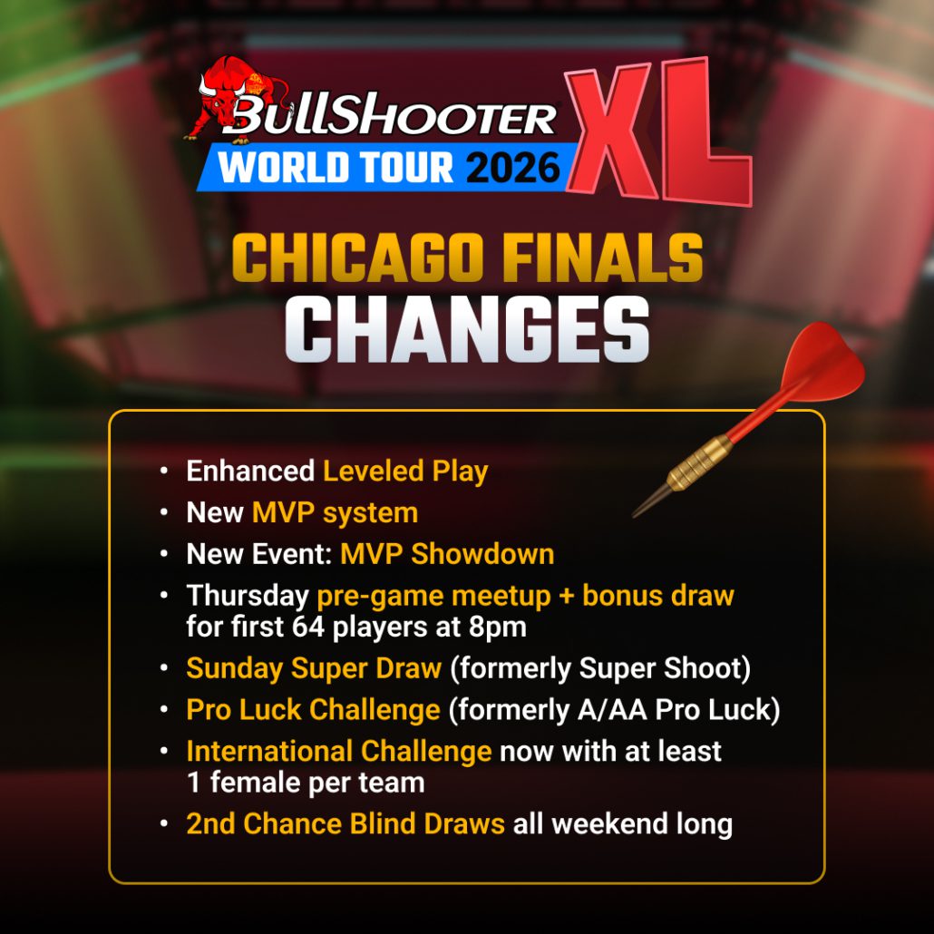 BullShooter tournament management reserves the right to evaluate entries based on knowledge of past tournament accomplishments in the sport of darting. It is the desire of the BullShooter A-Team, to provide as equalized competition as possible for all entrants. All decisions on placement will be prior to the event starting. All decisions by BullShooter tournament management are binding and final.