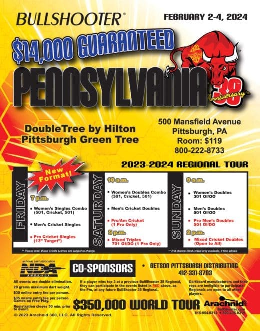 BullShooter tournament management reserves the right to evaluate entries based on knowledge of past tournament accomplishments in the sport of darting. It is the desire of Arachnid 360, and the A-Team, to provide as equalized competition as possible for all entrants. All decisions on placement will be prior to the event starting. All decisions by BullShooter tournament management are binding and final.
